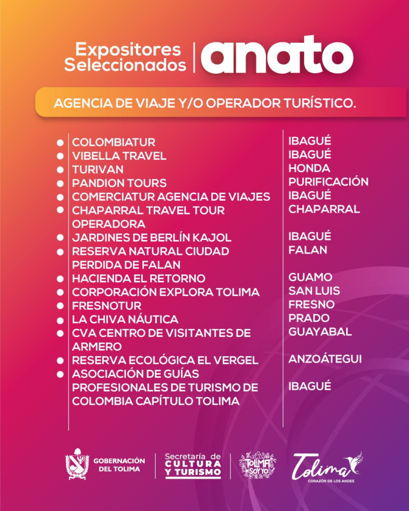 Como resultado de este proceso, fueron seleccionados 32 expositores, quienes participarán en esta importante vitrina del turismo nacional e internacional que se llevará a cabo del 25 al 27 de febrero de 2026 en Corferias. “Es importante destacar que 15 municipios del Tolima estarán presentes como expositores, entre ellos Chaparral, Anzoátegui, Guamo, Ibagué, Purificación, Melgar, Mariquita y Honda, entre otros”, afirmó Jennyfer Hernández, directora de Turismo del Tolima.