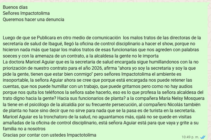 Anexamos el pantallazo del mensaje que llega al WhatsApp de Impacto Tolima, con el fin de hacer pública la denuncia de los Funcionarios de la Secretaría de Salud Municipal ¨